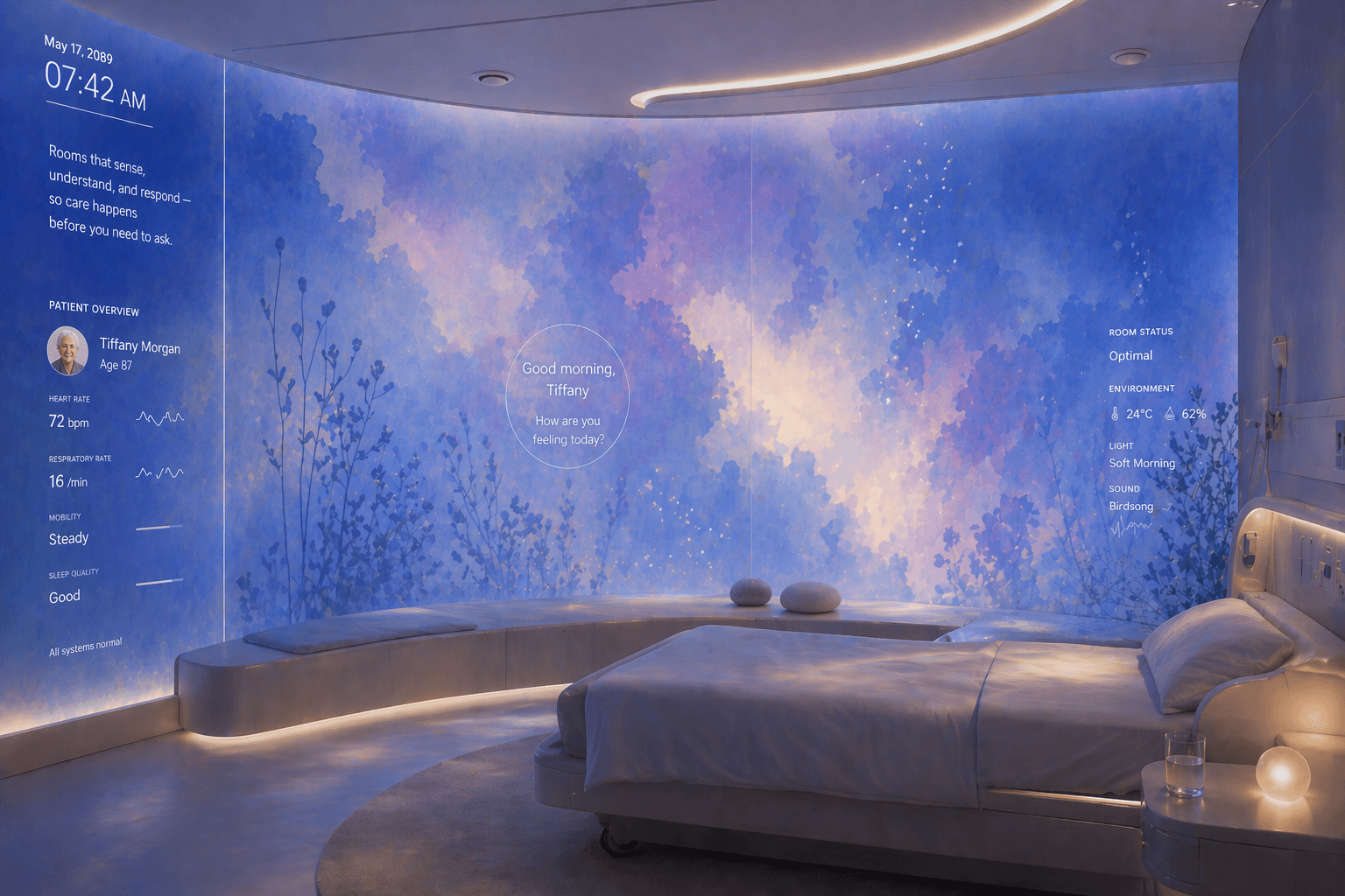 Hospital rooms are highly responsive environments, equipped with advanced sensors that track subtle movement and physiological signals. Instead of a mounted TV, the entire wall can display information, support communication, and provide interactive experiences.